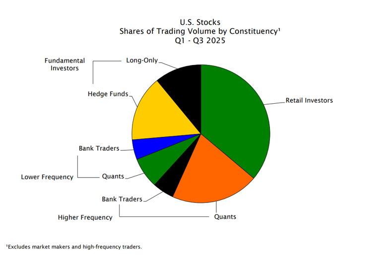 A reasonable question in response to this is: just how important are retail investors to the U.S. equity market? It turns out that the answer in 2025 is very important, as seen in the Empirical Research Partners’ analysis of trading volume this year, with retail investors acting as the largest source of trading volume in the market!