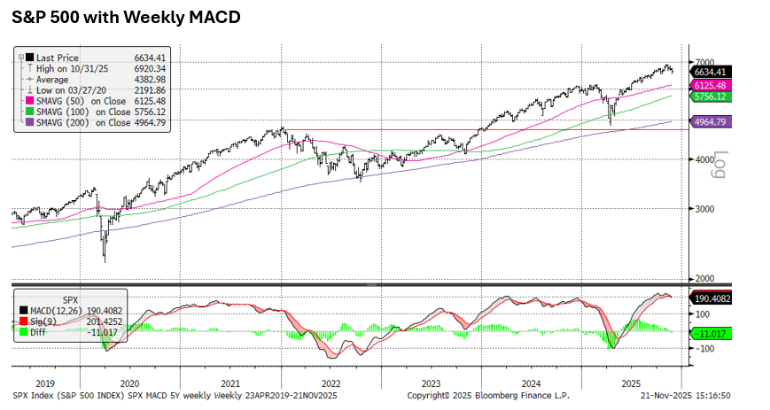 Mr. Roque also flagged the weekly Moving Average Convergence Divergence (MACD) turning negative for the first time since the April lows, suggesting that this era of ultra calm, up-and-to-the-right markets may be replaced by a choppier market experience.