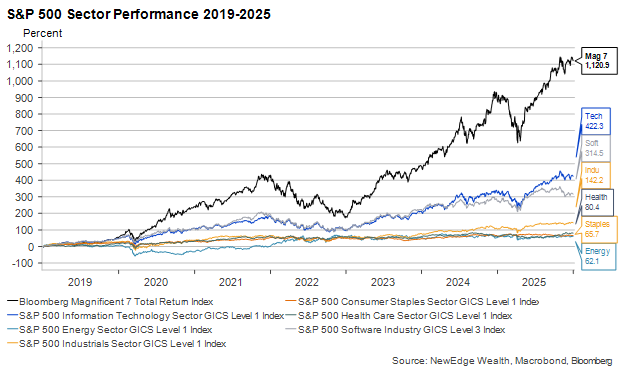 The chart below shows the degree of unrequited love that everything but the Magnificent 7 and the technology sector experienced from 2019-2025 (we choose 2019 because it was after the “Powell Pivot” of late 2018 that saw a drop in real yields that sparked a massive re-rating in Growth stocks). Over that six-year period, the Magnificent 7 outperformed non-tech sectors by over 1000%!