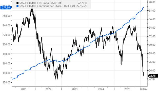 Lastly, let’s look at the recent rotation’s loser with Tech, and specifically Software. The chart below shows how the recent pronounced weakness in Software has been entirely driven by valuation compression, even as 12-month forward earnings estimates have been revised higher. This reflects market consternation about the long-term value of these businesses as today’s earnings power could get heavily disrupted by AI. Software stocks have the substantial burden of having to “disprove a negative” in the near term, as pointing to stable near-term earnings likely is not enough to allay these long-term disruption fears.