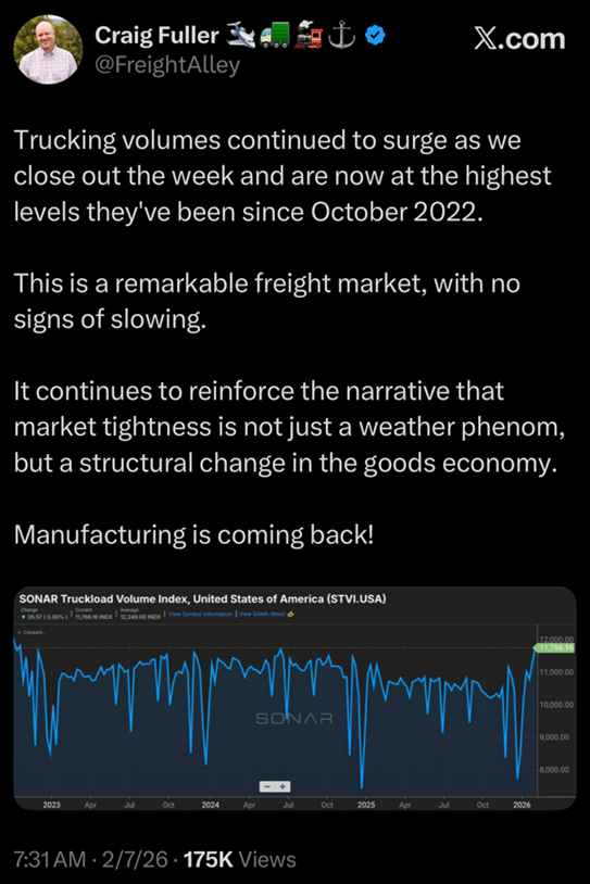 On to the better news, just take a look at Craig Fuller’s Freight Alley X feed, as he has been chronicling the recent tightening in the freight market that is seeing both freight volumes and freight pricing jump higher. Improved freight activity is often seen as an early sign of improved confidence and demand but notably can also be a function of supply disruptions, such as winter weather. For now, the freight market is sending a more optimistic message about growth, that is, of course, if you can avoid having a karaoke machine manufacturer cause a swoon in your stock price.