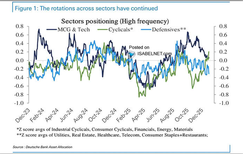 By cautioning that we should not ascribe too much narrative to price action, we are arguing that positioning has played a large role in driving the price performance of sectors recently, and the narratives (i.e., “cyclical reacceleration”) have simply followed. The chart from Deutsche Bank below shows how there has been a massive positioning component to recent rotations. At the peak of the Tech/Growth/Mag 7 trade back in October 2025, the market was max overweight these darling areas and max underweight Cyclicals (including Industrials, Materials, Energy, and more).