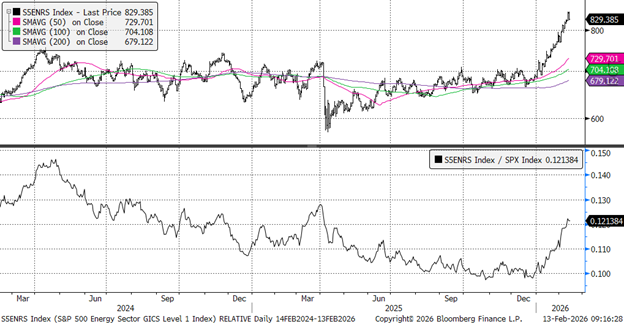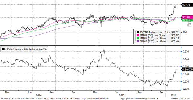 This argument that these shifts have been largely positioning can be seen by noting the similarities in the charts for the Consumer Staples and Energy sectors, two sectors that have been weak absolute and relative performers in recent years but have soared higher (“blown through the ceiling”) to start 2026.