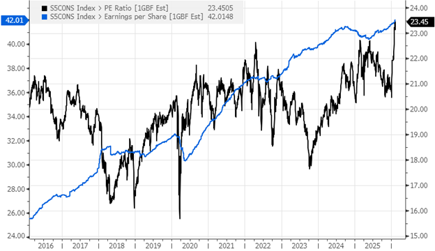 Consumer Staples Sector 12 Month Forward PE Multiple and EPS