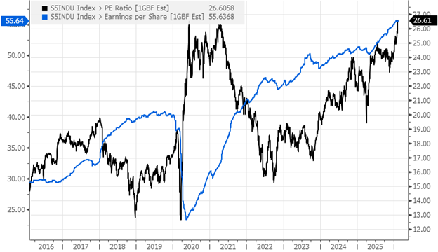 Industrials Sector 12 Month Forward PE Multiple and EPS