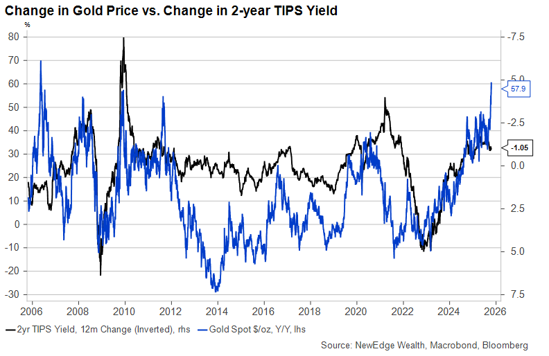 Eagle-eyed readers will note that the very recent lurch higher in gold has not been accompanied by a meaningful decline in real interest rates. We’ll get to that below.