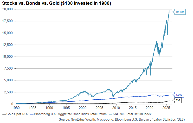 Whether gold has been a valuable addition to a diversified portfolio of stocks and bonds over time depends very much on one’s definition of “over time”. Start the clock in 1980, for example, a time of high inflation just before the Fed seized back its lost credibility, and you’ll see gold being lapped many times over by stocks and being more than doubled up by bonds. Much of this comes from the compounding of interest payments and dividends over time. Gold, notably, has neither.