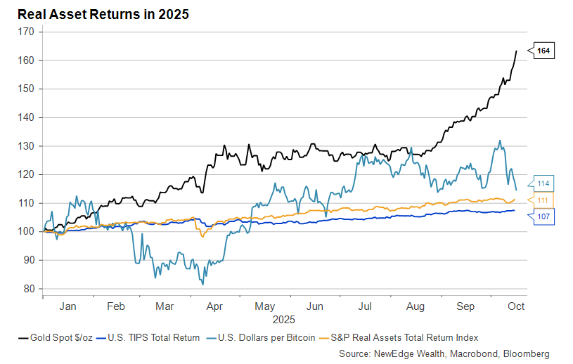2025 has been notable for the onset of tariffs, economic strife between the U.S. and China, and the passage of a deficit-increasing tax and spending package. All of these have likely contributed in some way to investor demand for gold. The prospect of the U.S. dollar no longer being the dominant global medium of exchange has increased demand for alternative currencies, including non-traditional ones like gold and certain cryptocurrencies.