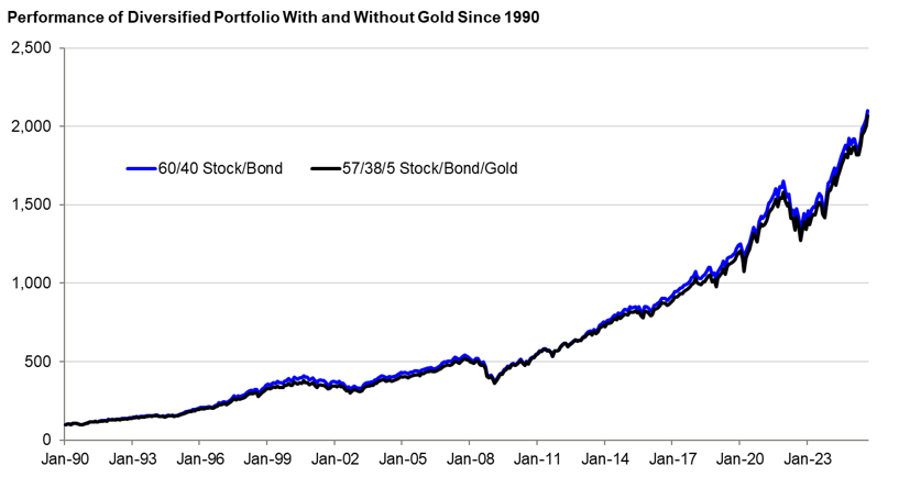 This chart shows the performance since 1990 of two portfolios. The first is a simple 60/40 U.S. Stock/Bond blend. The second includes a 5% gold position carved out of both stocks and bonds. Over the past 35 years, the average annual return on both portfolios has been 8.9%, although the one with gold has exhibited a little less volatility along the way.