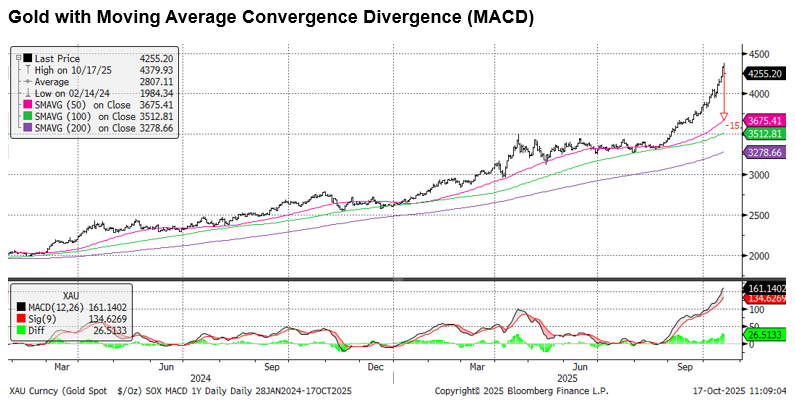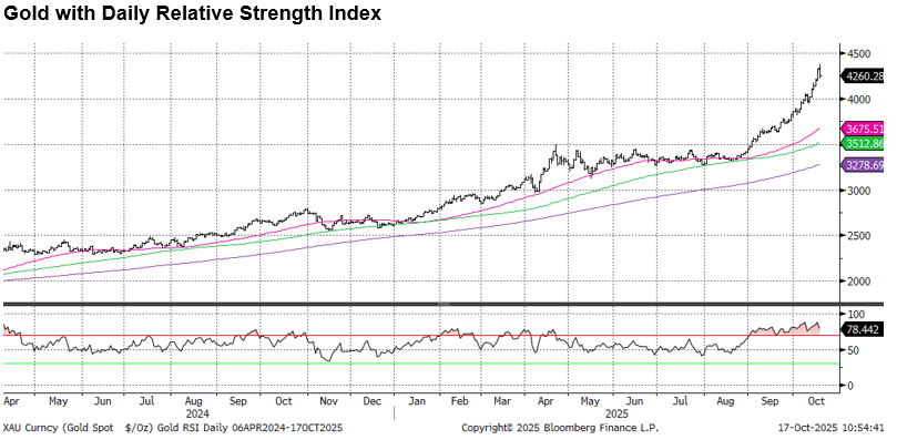 It’s hard to imagine a better scenario for gold than the one that’s unfolded in 2025: high deficits, global political uncertainty, a dovish Fed, a falling USD, and falling real interest rates. The question investors must ask is whether gold’s price already reflects this best-case outcome. Our analysis suggests that gold has run too far, too fast in the near term based on its historical relationship with similar assets like TIPS, but we can also use technical analysis to confirm this.