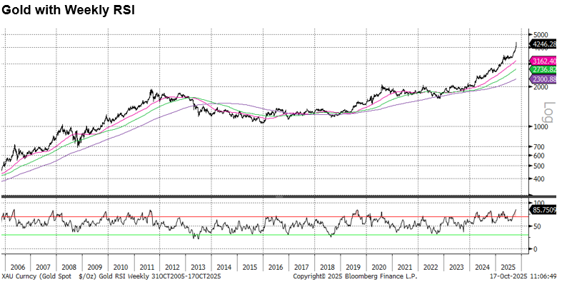 When we measure momentum and trend on a longer-term basis, gold has been overbought for eighteen months yet continues to surge to new highs. The chart below shows a weekly RSI for gold. Note how many times gold has shown an overbought condition, notably in early 2024 and 2025, but still managed to make new highs.