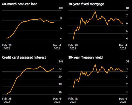 Investors and politicians have bemoaned the Fed’s lack of speed in getting interest rates down. Nearly 200 basis points of cuts in just over a year isn’t nothing, but consumers are not seeing sharply lower borrowing costs. This helpful set of charts from Bloomberg tells the story well. While the rates that consumers are most exposed to are down from their peaks, they remain well above the levels households became accustomed to in the 2010s and, more recently, in the immediate aftermath of the COVID-19 pandemic: