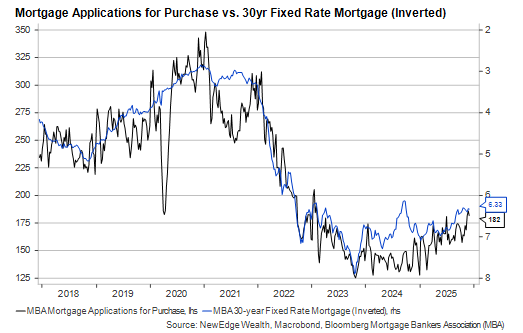 The 10-year U.S. Treasury rate is down a little in 2025, and 30-year fixed-rate mortgage rates are slightly lower than they were just before the Fed started cutting last year. But when rates are only down “slightly” or “a little”, the economic effects tend to be muted, as we’ve seen with the failure of mortgage applications to approach their 2018 average, let alone the peaks during the housing boom of late 2020 and early 2021.