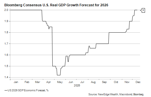 The simplest explanation for rates’ refusal to fall further is that the outlook for the global economy in 2026 remains solid and may, in fact, be getting better. Outside the U.S., central banks in Europe and Japan are likelier to be hiking than cutting rates next year. And as U.S. economists refine their forecasts for 2026, we are seeing more upward than downward revisions, as the Bloomberg consensus average shows: