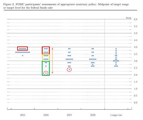 At least seven members, not all of whom will be voters in 2026, currently do not see the need for additional rate cuts next year. Only four members favor more than two cuts. Even if the new Chair’s “dot” looks like Governor Stephen Miran’s (the red circles on the chart below), it will be hard for him to persuade his colleagues, whom he has spent the past year implying are motivated by political partisanship, to go along (absent a sharp rise in unemployment).