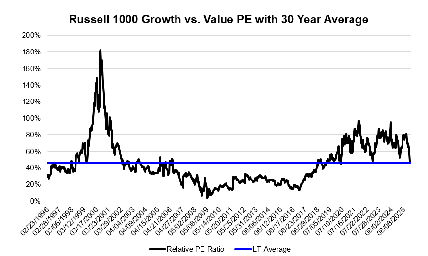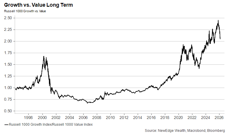 When looking at any rotation and asking how much further it can run, it is helpful to zoom out and put things in a longer historical context. The chart below shows this longer-term perspective, where today’s rotation away from Growth into Value looks like many of the short-term rotations we have seen in the last five years (such as early 2021, 2022, and early 2025). These brief pullbacks in Growth vs. Value occurred within the context of Growth outperforming Value by 280% over the last 10 years and 752% over the last 20 years!