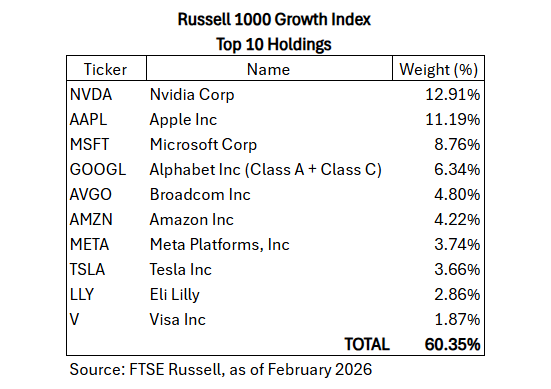 The best thing the Value index has going for it is that it is not as concentrated as the Growth index, which the table below displays. Contrast the top ten weights in Value constituting 20% of the index, vs. the top ten weights in Growth constituting 60% of the index.