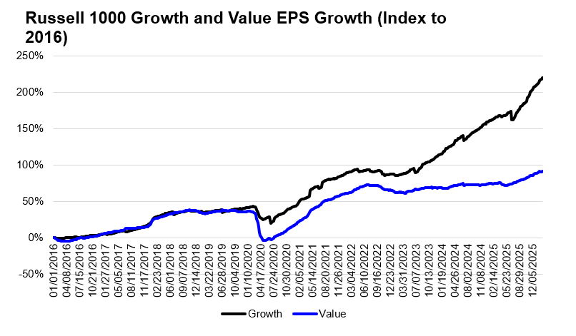 Look no further than the last decade of outperformance of Growth stocks over Value and see how it was justified by powerful Growth earnings. Since 2016, Growth has grown its EPS by a total of 219% versus 91% for Value. Notably, the majority of this outperformance has occurred in the last three years, with Growth earnings +70% and Value earnings up just +16%.