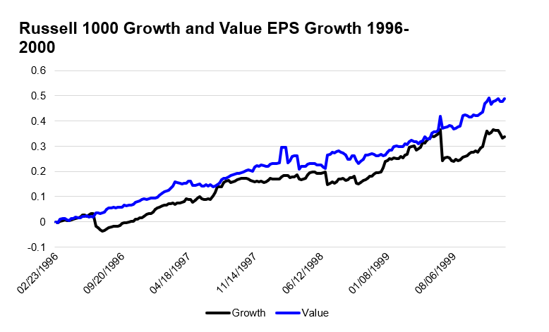 Of course, if this rotation is the start of a bigger shift in earnings fundamentals, we should keep in mind the next chart below, which shows that in the aftermath of the tech bubble unwind (after Growth got to a stellar 180% premium to Value!), Growth saw its monster premium over Value completely evaporate.