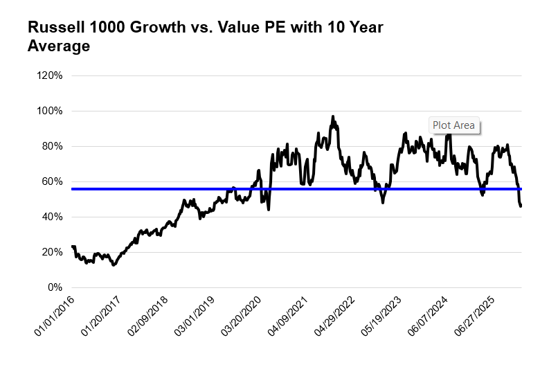 At the Growth outperformance peak in late October 2025, Growth traded to an 82% premium over Value, near the highs of its valuation premium over the last 10 years, as shown in the chart below.