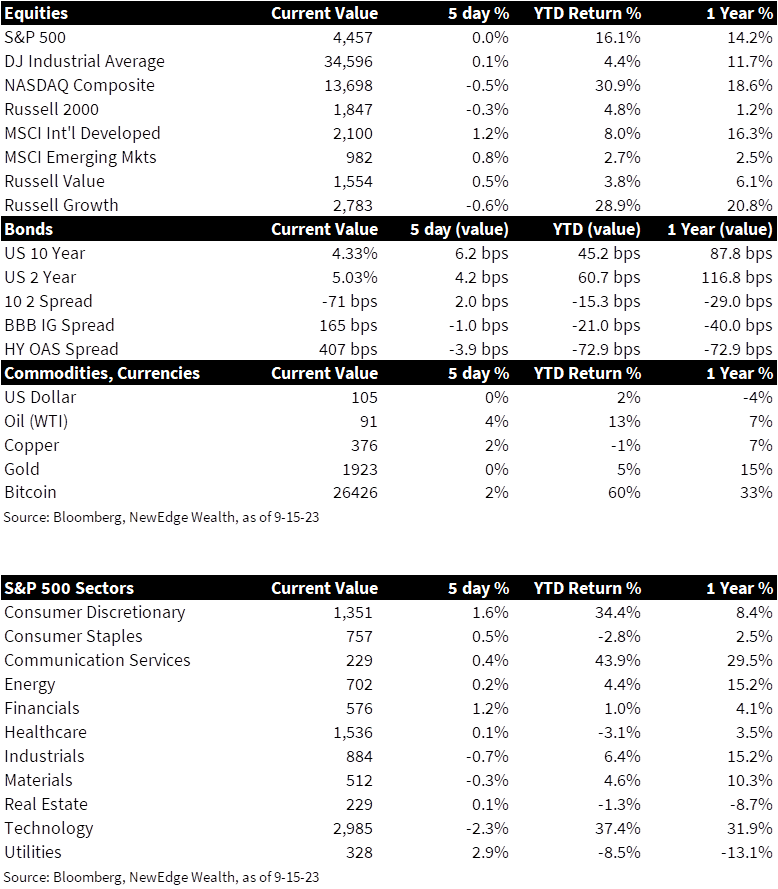 3. August CPI rises on a monthly basis – Wednesday’s CPI report for August showed that headline inflation was pretty much unchanged on an annual basis at 3.7%. However, the 0.6% increase to headline CPI on a monthly basis was the biggest monthly increase this year. About half of the inflation stemmed from rising energy prices after a 10% surge in gasoline prices. Core CPI came in slightly higher than expected at 0.3% month over month and 4.3% year over year, against estimates for 0.2% and 4.3%, respectively. Supercore CPI (measures core services ex shelter), a Fed watch item, also accelerated on a month over month basis to 0.3%.