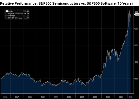 - The relative performance between the software and semiconductor industry groups has reached extreme levels, with narrative and sentiment largely influencing price action and overtaking fundamentals.