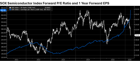 This boom is leading to massive increases in semiconductor-reported earnings and future expectations (chart below), which is causing valuations to look much cheaper today than we would expect in a more normal environment. Case in point, Micron Technologies, one of the largest memory chip makers in the world and a highly cyclical business, is trading today at just 5x FP/E despite shares returning more than 300% over the past 12 months. This has been driven by a surge in annual EPS, expected to rise from $8 in 2025 to $55 in 2026.