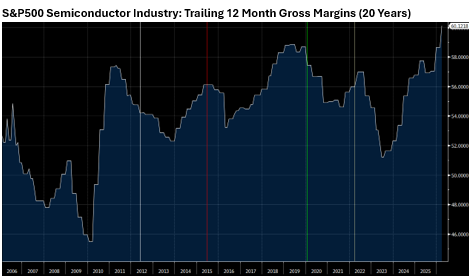 The key watch item for the semiconductor industry is gross margins, historically a strong indicator of the state of the cycle and forward performance. Today, trailing 12-month gross margins are at a record 60%, surpassing the prior peaks seen in 2010 and 2020. This indicates the current cycle has reached a more mature phase, making the forward risk and return less compelling, and suggests investors focus on more durable segments within the group.