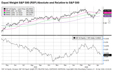 At its 2026 peak, the Equal Weight Index was outperforming the S&P 500 by 7%, but thanks to April’s narrow rally, this outperformance has been whittled down to just 1%.