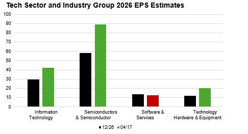 The chart below shows the same analysis of 2026 EPS growth expectations today vs. the end of last year for the Tech sector’s sub-industry groups. You can see how the semiconductor group has experienced a huge jump in its expected earnings growth (to nearly 90% for 2026!), while Software earnings have been trimmed slightly and Tech Hardware has been revised higher. Note that this Tech Hardware EPS growth and positive revision is directly related to the semi trade as well, as a name like Sandisk (SNDK), a flash memory semiconductor company, is included in this cohort and has seen a 5.6x increase in its 12-month forward EPS estimates in the last 4 months!