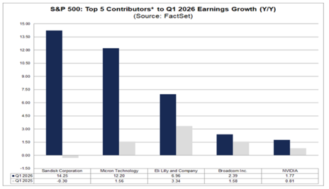 The analysis from Factset below shows that when you remove NVDA from the Magnificent 7, this cohort’s pace of earnings growth for 2026 gets cut in half, leaving Mag 7 to grow below the pace of the 493. But before you get excited that this superior 493 growth is a sign of broadening out, appreciate that this growth is also being significantly boosted by the semi trade, with three of the four largest contributors to the 493 growth being Broadcom (AVGO), Sandisk (SNDK) and Micron (MU).