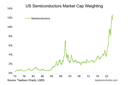 The chart below from Callum Thomas shows the historical weighting of semiconductors in the S&P 500 and how it has catapulted up to a whopping 14% given the AI-fueled rally (double the tech-bubble weight in 2000).