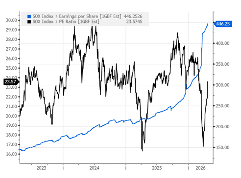 As we showed in the prior section, the strength in semiconductor stocks has been driven by a true boom in semiconductor earnings, which the chart below shows have hockey-sticked higher in 2026.