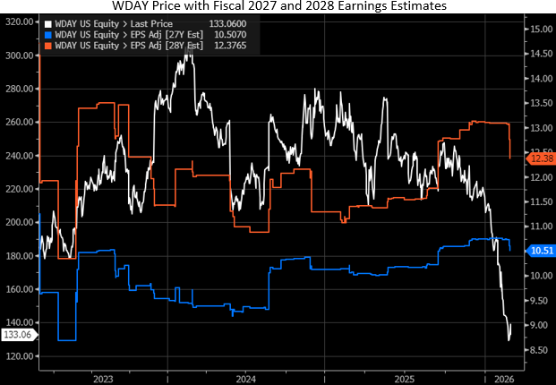 We always emphasize that price does, in fact, lead data, so seeing share prices react before fundamentals is perfectly normal. But this week, we actually began to see EPS forecast cuts for software names that reported earnings. For example, the chart below shows the earnings estimates for software company Workday (WDAY) and how they have been trimmed for calendar 2027 and 2028 (fiscal 2026 and 2027). Of course, the move in the stock is far larger than the cut in earnings estimate cuts, but, as we pointed out above, price drops reflect diminished market willingness to extrapolate today’s earnings power perpetually into the AI future.