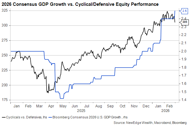 This upward revision to economic growth has effectively given investors the comfort to “hide out” from AI disruption in parts of the market that historically considered riskier, lower quality, and more volatile/cyclical. This is why we are calling this backdrop not a “risk-off”, but a “risk-swap” environment. If we were to see a greater weakening in the economic outlook, whether it is due to AI disruption or credit/liquidity tightening, then we do not think these cyclical areas of the market would be able to sustain their leadership (which is another reason why relative strength in defensives like Staples, Utilities, and Healthcare must also be monitored closely).