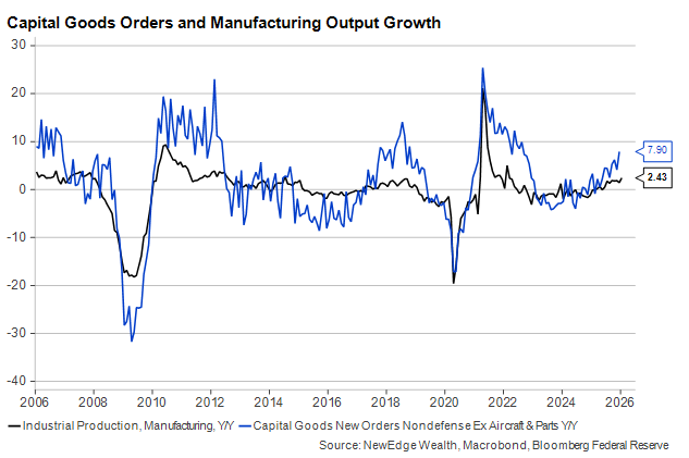 The positive vibes from business sentiment go beyond the single ISM poll and include the vast majority of regional Fed surveys taken each month. Companies are feeling better about the environment here in early 2026 for reasons that seem to have little to do with AI. Orders for capital goods have picked up, and even manufacturing output (measured in volume, not dollars) has escaped a multi-year period of stagnation: