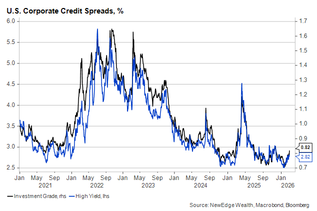 But the bulk of credit concerns is coming from outside the corporate bond markets. Stocks of leading asset managers that focus on private credit have been pummeled for more than a year as investors try to mark to market these normally opaque portfolios. Strategists at UBS revised up their expected default rate on private loans to 15% for software exposure, which is enough to keep markets spooked and financial stocks under pressure.