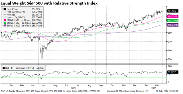 But as has been customary for the market in 2026, this softness in the capitalization weight index stands in contrast to the relative resilience of the Equal Weight S&P 500, shown below at just a hair under new all-time highs and in a much more distinct uptrend.