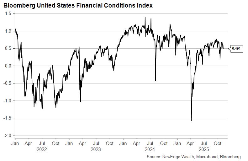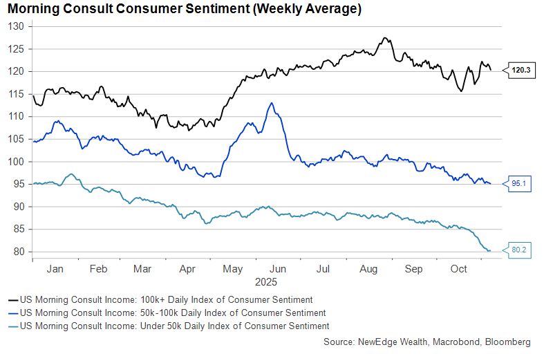 Auto sales were down in October, and both the Manufacturing and Services ISM business surveys showed that the labor market remains soft. High-frequency surveys of consumer sentiment have frayed at the lower end of the income scale, potentially related to the cessation of federal benefits connected to the shutdown.