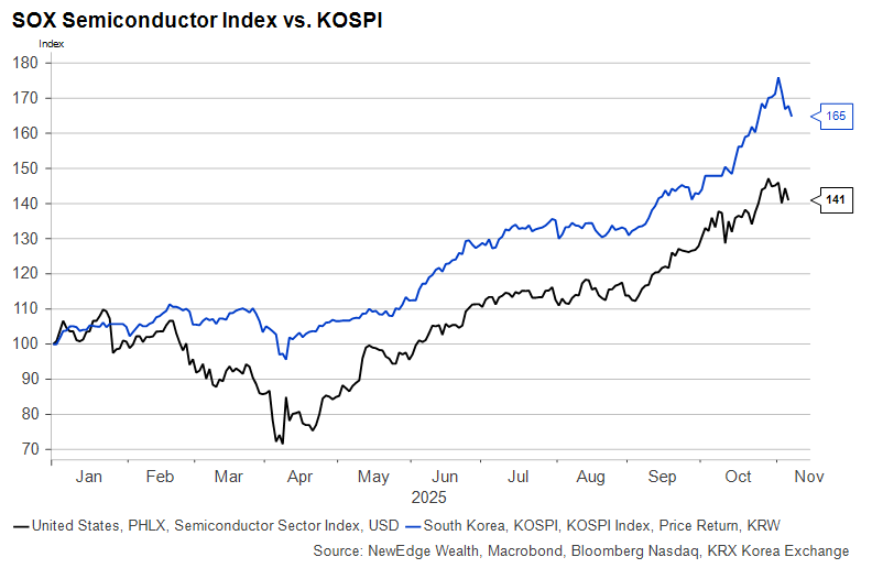 The S&P 500 continues to trade just below its all-time high, and areas of the global market that had rocketed higher over the past two months have taken a breather. Semiconductor stocks and South Korea’s KOSPI index were poster children for the late summer melt up. Their pullbacks look far less worrying in the context of their returns over the course of 2025:
